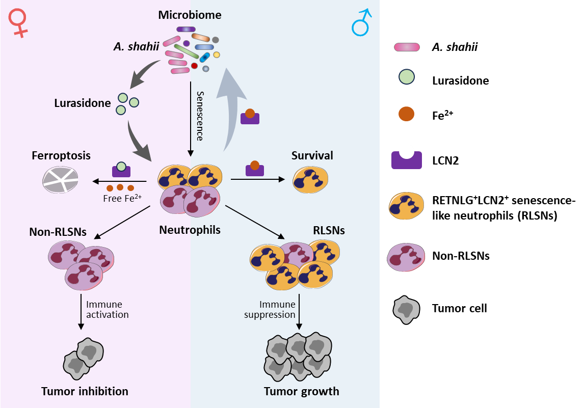 基于先前研究提示中性粒細胞衰老由腸道微生物群調節,研究團隊進一步發現雌性小鼠腸道中一種名為Alistipes shahii的腸道菌(以下簡稱A.?shahii)顯著增多,且該菌相關的代謝產物魯拉西酮的水平在雌性小鼠中更高。魯拉西酮可直接靶向RLSNs中的標志性蛋白——LCN2,由于LCN2是一種鐵螯合蛋白,由此釋放細胞內Fe2?并促進RLSNs的鐵死亡,最終清除了雌性腫瘤中富集的RLSNs。而雄性因缺乏A.?shahii及魯拉西酮,導致RLSNs的鐵死亡被抑制,并大量積累在雄性腫瘤微環境中以抑制抗腫瘤免疫。此外,雄性體內積累的RLSNs會分泌大量LCN2蛋白以清除對鐵敏感的A. shahii,進一步抑制了體內A. shahii的含量。