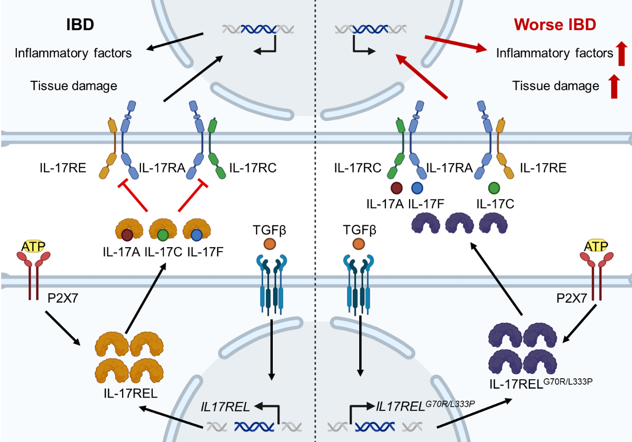 研究團(tuán)隊(duì)長期從事IL-17家族細(xì)胞因子及其受體的研究,取得一系列研究成果(Nat. Immunol.?2011; Nat. Med.?2012; Immunity?2014, 2015, 2019)。本研究首次鑒定并系統(tǒng)闡明了IL-17家族的誘餌受體IL-17REL,解析了其表達(dá)調(diào)控機(jī)制及免疫功能,并明確其功能性突變是IBD的重要遺傳致病因素之一。這一發(fā)現(xiàn)不僅為深入理解IBD的發(fā)病機(jī)制提供了新的理論框架,也為開發(fā)靶向IL-17信號(hào)通路的創(chuàng)新治療策略提供了全新的潛在靶點(diǎn)。