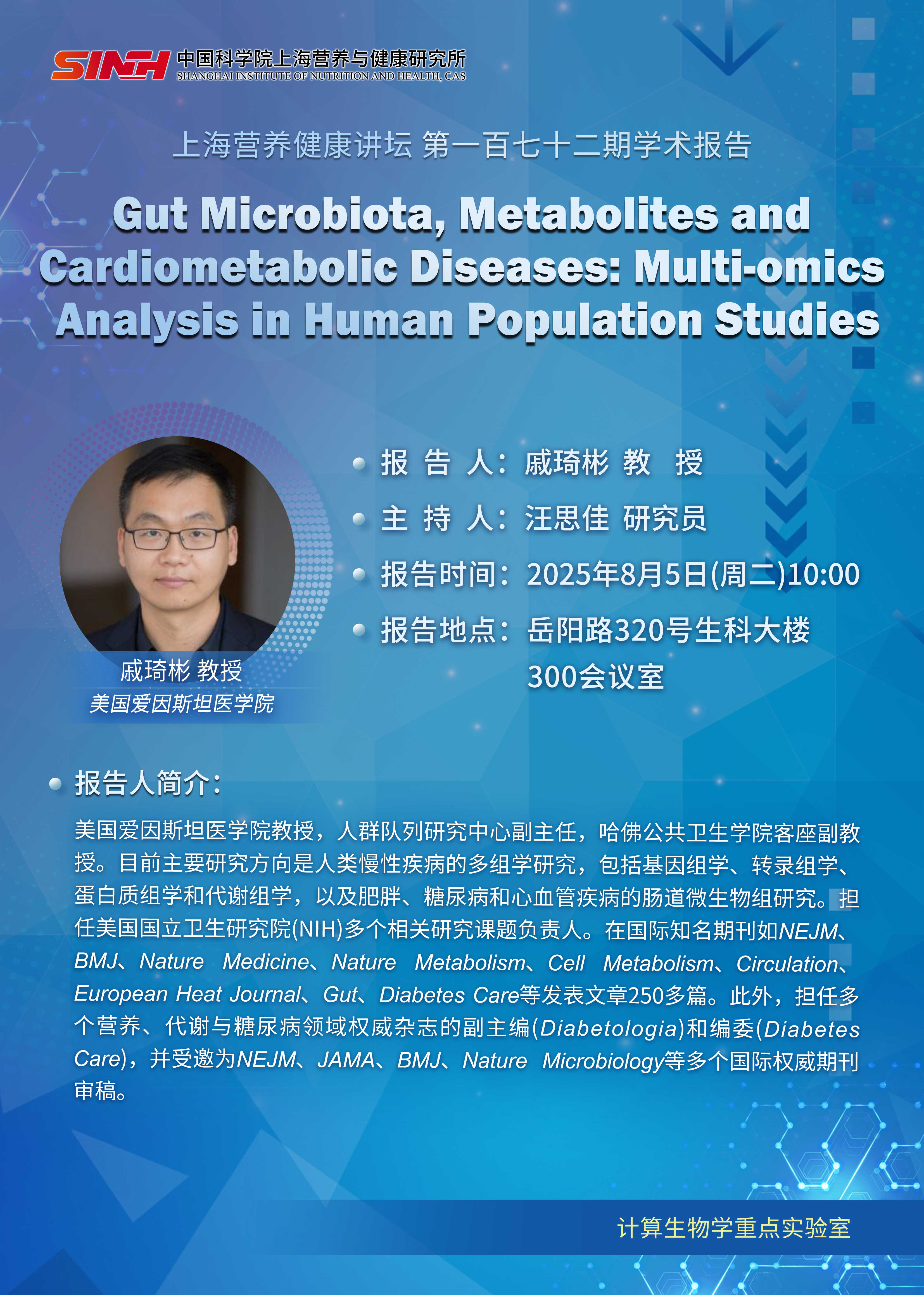 8月5日|Gut Microbiota, Metabolites and Cardiometabolic Diseases:?Multi-omics Analysis in Human Population Studies-上海營養健康講壇